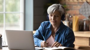 60s,Woman,Sit,At,Table,Wear,Headphones,Take,Notes,Gain
